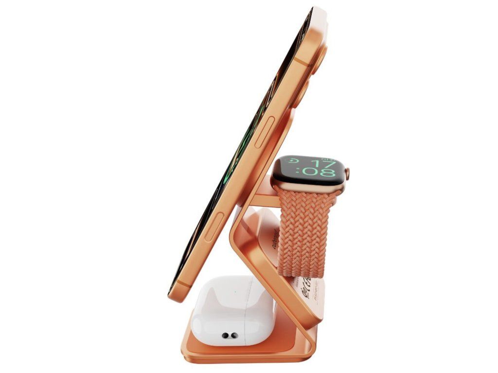 Pevně držící magnet pro iPhone, výklopné rameno pro Apple Watch s podporou rychlonabíjení a dedikovaná plocha pro tvé AirPods.