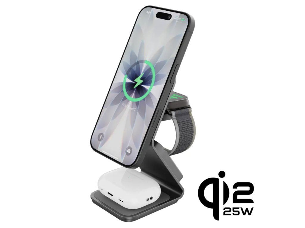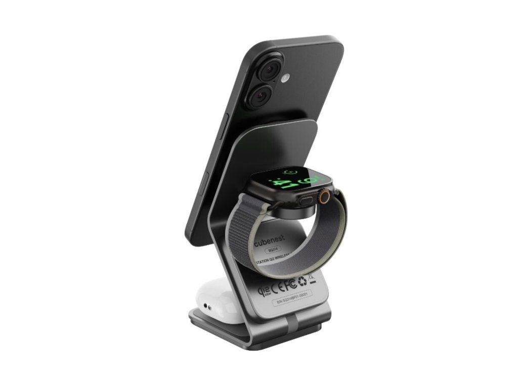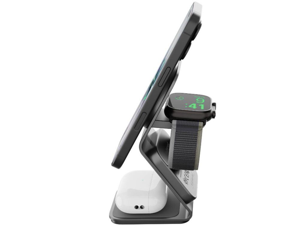 Pevně držící magnet pro iPhone, výklopné rameno pro Apple Watch s podporou rychlonabíjení a dedikovaná plocha pro tvé AirPods.