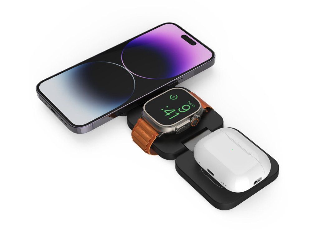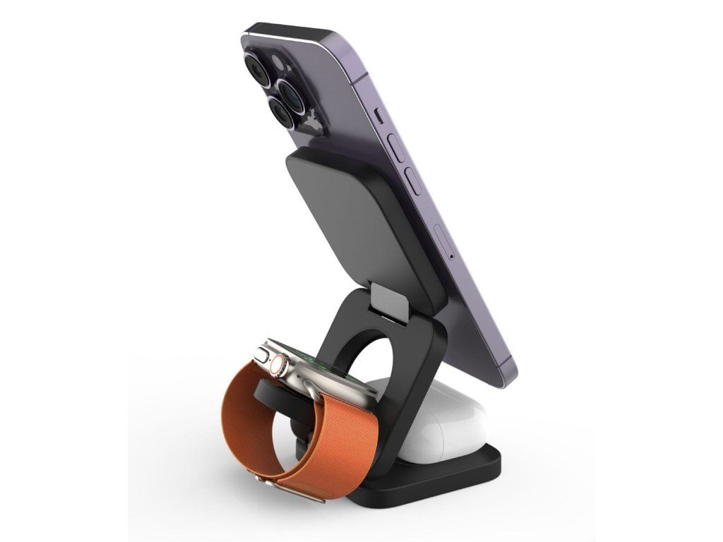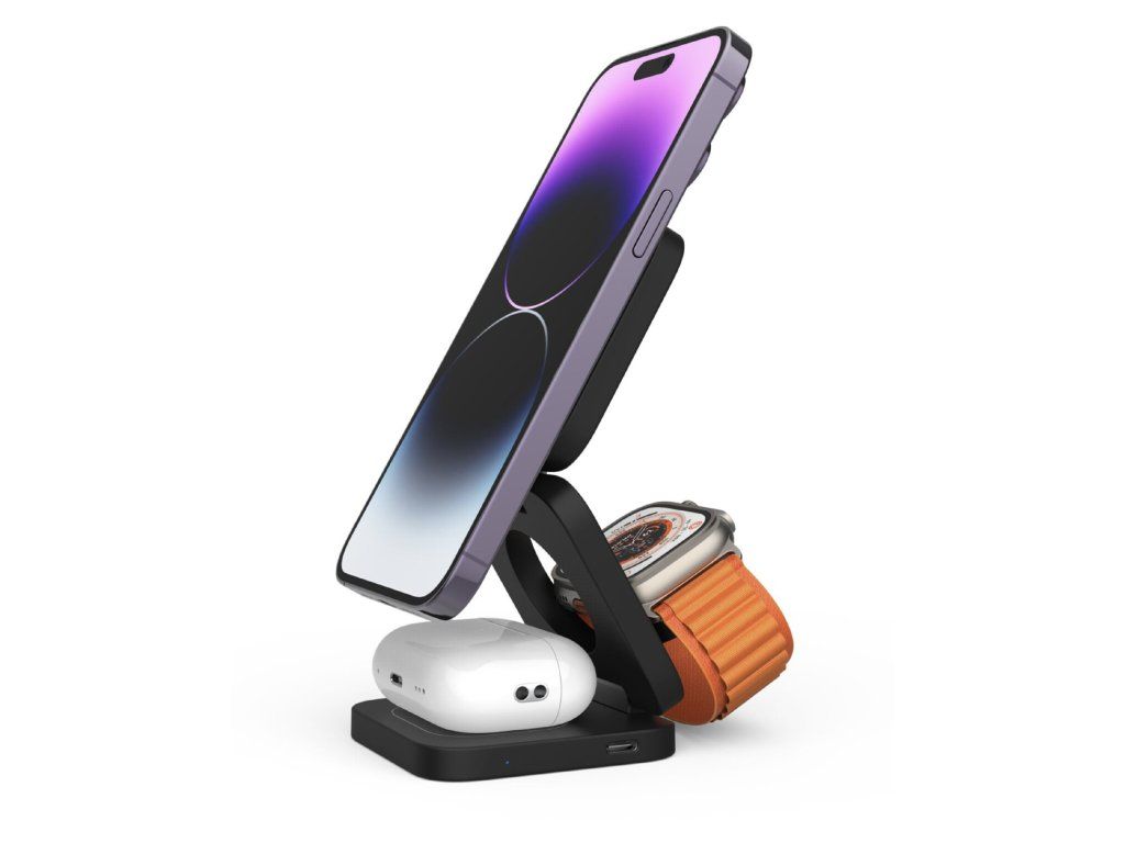 Váš iPhone zůstane bezpečně na svém místě v jakékoli poloze. Vyhrazené plochy se pak postarají o vaše Apple Watch a AirPods – vše z jednoho kabelu.
