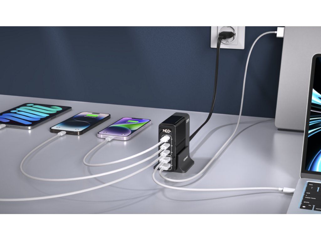 Dostatek energie pro nejnáročnější laptopy. Adaptér inteligentně rozděluje výkon mezi 5 portů tak, aby každé zařízení dostalo maximum.